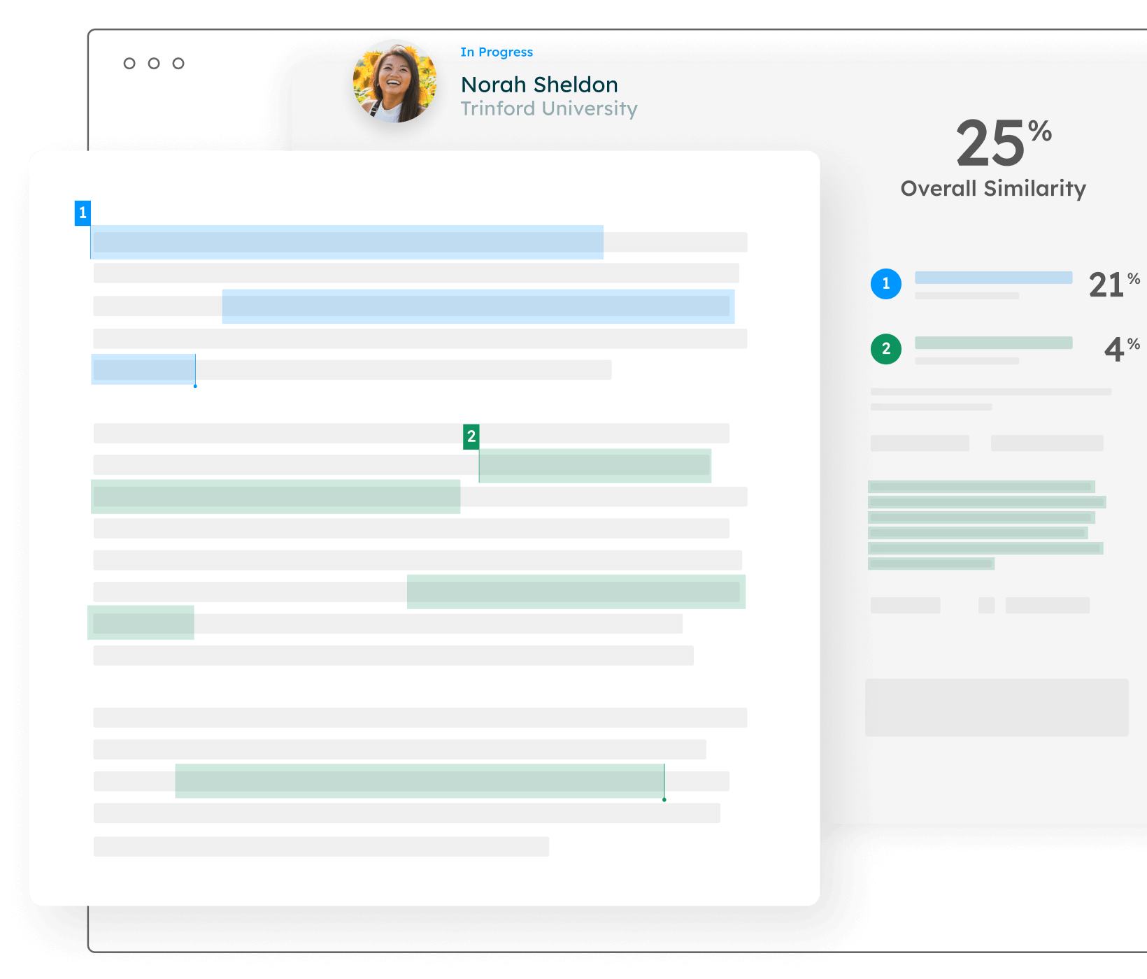 | Bir ödevin benzerlik puanını görüntüleyin, renk kodlu sonuçlar alın ve kaynaklarla yan yana karşılaştırmalar yapın. Gereksiz eşleşmeleri hariç tutun. |